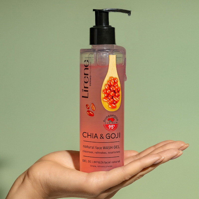 ژل شستشوی Lirene حاوی CHIA&GOJI حجم 190 میل با فرمولی طبیعی و ملایم، بهطور کامل آلودگیها و آرایش را پاک کرده و پوست را نرم و تغذیه میکند.